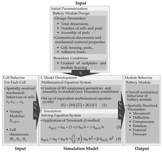 The battery module is geometrically discretized by mass nodes and interconnecting springs with stiffnesses according to this modelling approach. All masses and spring stiffnesses can be written into a mass and stiffness matrix. The displacement and acceleration of each mass node as well the forces which act on them are accordingly represented by vectors. By setting up Equation (2), a mathematical equation system is formed for describing the mechanical behaviour of each node as a result of the acting forces. By determining the movement of each mass node, it is possible to describe the mechanical behaviour of the entire module. The equations generated by the algorithm are subsequently solved with the Newmark-beta method []. The numerical integration method is paramount for the model and follows a general procedure, consisting of a series of iteration steps to solve the following by Newman-defined relations []:
