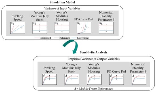 A modified local sensitivity study is conducted not only to validate the simplified model regarding its prediction ability for the dynamic swelling behaviour of the investigated battery module but also to prove its robustness. For this reason, a systematic simulation study will be conducted in this section. The effect of the stiffness of different battery module components on the overall module force–displacement behaviour is studied. Therefore, the focus is placed on the module components along the main axis of cell swelling, which have the highest impact on module deformation (Figure 2). These include the stiffnesses of the jelly stack of the cells, the module housing, which consists of multiple components, such as the top, bottom and end plate, and foam pads. In Figure 4, a schematic overview of the local sensitivity study is pictured.