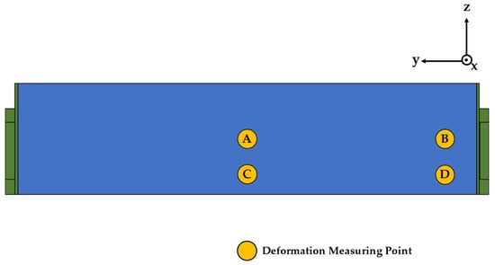 Illustration of deformation measuring points on battery module housing [,]. Redrawn with permission from Bozalp et al., Proceedings of the 11th International Conference on Simulation and Modeling Methodologies, Technologies and Applications SIMULTECH; published by SIMULTECH, 2021. Redrawn with permission from Bozalp et al., Proceedings of the International Conference and Exhibition SIA Paris 2021 Powertrain & Power Electronics; published by SIA, 2021.