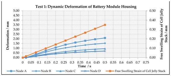Comparison of time-dependent deformations of battery module housing at different nodes in dependence of swelling speed of cell jelly stacks (Test 1–3). Considered deformation point on the module housing is highlighted in purple: (a) node A (b) node B (c) node C (d) node D.