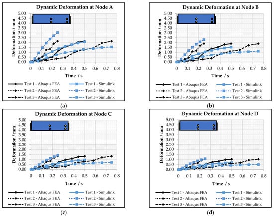 Comparison of time-dependent deformation of battery module housing at different nodes in dependence of pad force–deflection curve and β-parameter. Considered deformation point on the module housing is highlighted in purple: (a) node A (b) node B (c) node C (d) node D.