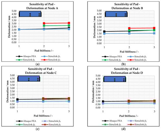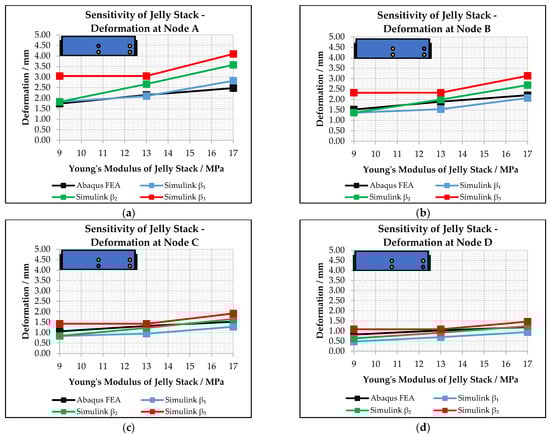 After the simulation time of 0.5 s was identified as the one with the best matching of the results, the following sensitive analyses were conducted, applying the determined simulation time. In general, the sensitive analyses show that the novel model is robust and able to predict the effect of design changes on the mechanical stiffnesses of the investigated components, when the cells reach their maximum swelling state at the end of the simulation time. As seen in Figure 8, Figure 9 and Figure 10, the model maps the slope and direction of the deformation gradient correctly, when changing the stiffnessor force–displacement curve of an investigated design input parameter. Considering the reference β-parameter, it is noticeable that the highest match of the model results is provided for Node A, while the other nodes follow the general trend well, when changing the stiffness of a parameter but keeping an off-set. The previously described model parameter differences, such as element number, size and shape, have a major influence on the displacement of nodes, possibly explaining this behaviour. Another factor which needs to be considered when it comes to the accuracy of the novel model is the numerical stability factor β. The acceleration during the time intervals, expressed by the parameter, impacts the calculated displacement of the model nodes and consequently the accuracy of the predictions, which is most likely also due to the non-consideration of damping effects. In Figure 8, Figure 9 and Figure 10, it is shown that a change in the parameter influences the simplified model results in comparison to the ones of the complex model. Especially, nodes B, C and D can reach a much better accuracy by adopting the parameter β. In the considered range for the input parameters, all the simulated test cases finished without any instability in the numeric procedure except for the investigated ones of the soft pad. Here, a variation in the β-parameter from its reference value leads to instabilities in the numerical solving procedure, ending with a numerical abortion. This is another good example for the influence and effectiveness of the parameter to actively control the numerical stability of a simulation.
