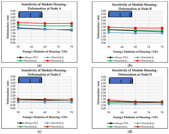 Comparison of time-dependent deformation of battery module housing at different nodes in dependence of Young’s Modulus of battery module housing and β-parameter. Considered deformation point on the module housing is highlighted in purple: (a) node A (b) node B (c) node C (d) node D.