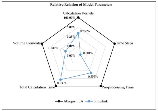 In the first step of Test 1, the reference setting of the module design was configured, and its swelling behaviour was simulated. The results, presented in Figure 6, clearly show that the novel model not only has the ability of resolving the overall module spatially but also temporally. While in the first time steps until 0.02 s each cell jelly stack swells by 0.014 mm, the module housing does not show any deformation, which is mainly due to the foam pads, which absorb the forces during that time and doing so, largely restrain them from being passed on to the module frame. Afterwards, the forces act on the inside of the module housing, and a deformation is effective on the module outside. The deformations are distributed inhomogeneously over the housing area in the main swelling direction, while the biggest deformation can be observed in the centre region (Node A). This proportionally large area has a lower structural stiffness compared to the edge and corner regions (Node B and D) and therefore gives in more easily, even though the material stiffness is parametrized the same for the whole housing components. When comparing the results of the simplified model from Simulink with different simulation times and therefore different swelling speeds of the cell jelly stacks, the slope of the module housing deformations also develops accordingly to the speed (Figure 7). A comparison of the results of Test 1 with those of the complex model reveals that they match well after firstly overpredicting them. On the other hand, when comparing the results of Tests 2 and 3, where the simulation time is reduced and elongated, the simplified model firstly also overpredicts the deformations (Figure 7). While in Test 2, the overpredicted deformations keep increasing, in Test 3, at first, they level but end up underestimating the deformations towards the end of the simulation time. Consequently, the complex model predicts, independent of the swelling speed, the same total module housing deformations, while in the simplified model, the deformations increase with higher swelling speeds. One possible explanation for this behaviour in the simplified model is the non-consideration of damping effects in its main underlying Equation (2). For example, vibrations or structural responses in the model are not damped and therefore can build up over the simulation time, leading to higher total deformations. On the other hand, accuracy differences between the model results in general are due to the different time step sizes used in each model. Specifically, the time step size in the simplified model is greater than the one used in Abaqus FEA by a factor of nearly 800, allowing for much shorter total computation times (Figure 11). Since there is a general correspondence between time step size as well as number and model prediction accuracy, this in turn implies that deviations in the results are to be expected. Furthermore, the novel model has more simplifications to it, such as a significantly lower number of volume elements, which would also explain deviations and lower accuracy. In total, the number of elements used in the complex model is higher by a factor of nearly 2300 (Figure 11). Not only does the number of elements differ but also their shape. While the complex model uses different kind of element shapes, depending on the component and its geometric complexity, in order to simulate with best possible accuracy, the simplified model only uses one particular shape for the reasons of simplification and speed in the model build-up phase. Due to the listed model parameters, which are known for having a strong influence on the results, further analyses are recommended to fully clarify their effects on the results of the simplified model.