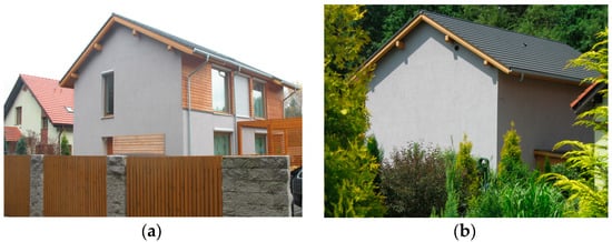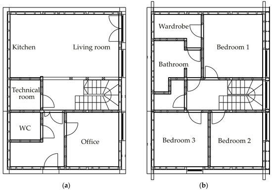 The wall structure consists of a 16 cm thick timber frame filled with mineral wool and stiffened on both sides with chipboard, with an additional 25 cm thick thermal insulation layer on the external side. The building is available in 8 external wall options, which differ in the type of materials used, i.e., structure stiffening boards (OSB or Fermacell chipboard), external thermal insulation (polystyrene foam, mineral wool, and wood wool), and vapour-barrier foil (standard vapour-barrier foil, Vario foil). Details of the structure, including a description of the options and a hygrothermal analysis of the partitions, are described in [19]. The value of the heat transfer coefficient through partitions is similar in all options and amounts to 0.08 W·m−2·K−1. The building is settled on a reinforced concrete slab, which was made on a 40 cm layer of perimetric slabs, insulating the building from the ground. The attic of the building has a 20 cm thick timber structure filled with mineral wool. It is also additionally insulated with a 30 cm layer of mineral wool.