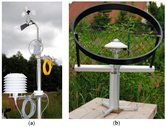 Meteorological mast equipped with sensors for temperature, humidity, wind speed and direction, and total radiation (a). Pyranometer—measurement of diffuse radiation (b).