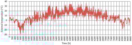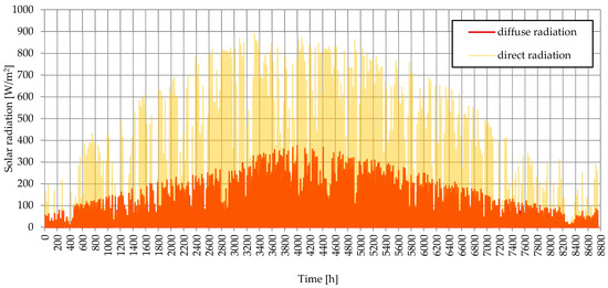 A period of one measurement year was selected for the analysis, based on which a file in *.wac format was prepared with the above-mentioned climate parameters, which was then used as part of further simulations. The recorded measurements were saved at 1 or 6 min intervals, depending on the recording equipment used. Due to the required 1 h time step in further simulation calculations, the measured data were averaged to hourly values.