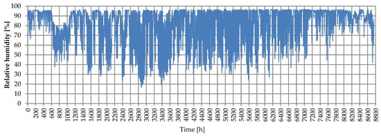 The analysed period was characteristic of significant variability in external air temperatures. The lowest temperature recorded was −28.2 °C, while the highest temperature was 36.2 °C. The average annual temperature was 8.4 °C. The course of the recorded measurements is shown in Figure 5. For external relative humidity, the lowest recorded value was 16.5%, and the highest was 96.9%. The average external relative humidity was 79.8%. The course of the recorded relative humidity measurements is shown in Figure 6.