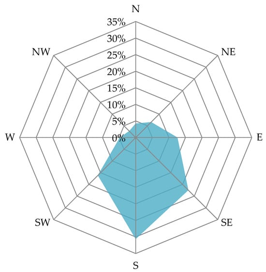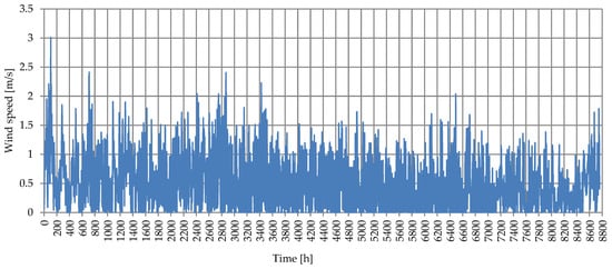 During the period under consideration, the prevailing winds came from a southerly and south-easterly direction, accounting for 30.6% and 22.4% of all recorded measurements, respectively. The wind speed fluctuated between 0 and 3.01 m/s, with an average value of 0.49 m/s. The annual measurement of wind direction is shown in Figure 7, while the wind speed for the analysed period is shown in Figure 8.