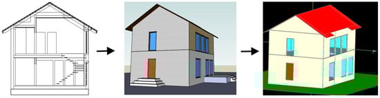 For the purposes of simulating energy demand in the context of heating, a three-dimensional model of the building was developed in the SketchUp graphics program, and then the prepared model was implemented into WUFI®Plus 3.5, where the material data of the partitions, the technical systems with which the building was equipped (the central heating system, the mechanical ventilation system with heat recovery), and the external climate data measured during the study were entered (Figure 10).