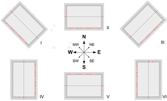 In the case study, 6 calculation options were conducted, considering the different locations of the building in relation to the cardinal directions. The first calculation option assumed a location according to the actual south-west orientation of the building. This option also allowed the developed calculation model to be compared to the actual measurements of energy consumption in the building, as described in the article [21]. Subsequent calculation options assumed a different building orientation: south, south-east, east, and west. The calculations for the north-east and north-west orientations were omitted due to their contradiction with the assumptions of passive construction, where it is important to make the best use of solar radiation gains. For comparison purposes only, calculations were made for the least favourable option where solar radiation is lowest, i.e., exposure of windows to the north. The options analysed are shown in Figure 11.