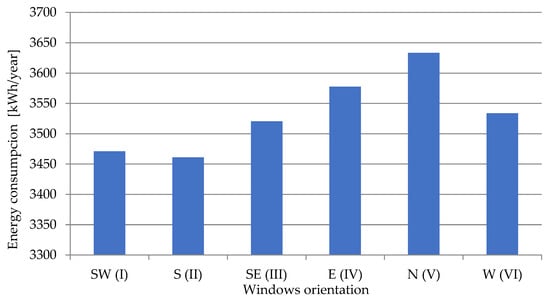 The energy consumption calculations started with option I, which corresponds to the actual location of the building, in which all the windows are oriented towards the south-west. In this case, the annual energy demand for heating was 3471.1 kWh. This value is close to the values measured during the experimental research, where the annual energy demand of the building for heating was 3554.8 kWh. Another option for calculation II was to orient the main glazed façade to the south. In this case, the calculated annual energy requirement of the building for heating, as expected, was the lowest of those analysed, i.e., 3461 kWh. In option III, with the windows facing south-east, the energy demand was 3520.6 kWh, while in option IV, eastern, it was 3577.4 kWh, and in option VI, western, it was 3533.8 kWh. Option V was the most unfavourable; with the windows facing north, the energy demand for heating was 3633.4 kWh. A summary of the results for the options analysed can be found in Figure 12.