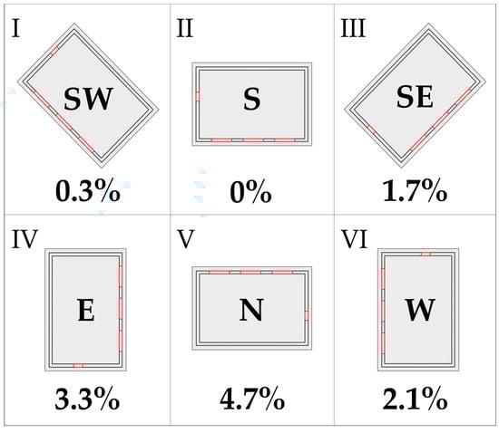 In the building analysed, the difference in annual energy demand for heating between the extreme cases, i.e., orientation of the glazing of the building to the south (II) and north (V) sides, was 171 kWh/year, which is 4.7%. The scenario with glazing on the north façade is not feasible due to the requirements and assumptions for passive houses, which dictate that glazing on the north side should be reduced or even completely abandoned. However, this option is intended to show the differences in energy demand at the extremes. On the other hand, a comparison of the actual option with windows facing south-west (I) with the southern option (II), the most optimal, showed the smallest difference amongst the analysed cases of 10.1 kWh/year, which constitutes 0.3%. In contrast, the difference between options (II) and (III) was 59.6 kWh/year. Considering other options, (IV) and (VI), the differences with respect to the southern façade (II) were 116.4 kwh/year and 72.8 kWh/year, respectively. (Figure 13) shows the difference in energy demand as a percentage for the options analysed.