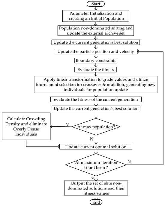 The algorithm first constructs the external archive set via non-dominant sorting and then iteratively optimizes the current population using particle swarm optimization, while combining the selection, crossover, and variation operation of the genetic algorithm to increase the diversity of the population simultaneously. During the iterative process, the external set of archives and the current contemporary optimal solutions are dynamically updated to guarantee the global search capability of the algorithm. Finally, by reaching the set number of iterations, the excellent non-dominant solution set is obtained as the output result of the algorithm. The running parameters of the algorithm are as follows: random number seed: 1; number of leading solution sets: ; maximum number of iterations: ; cross probability: ; variation rate ; inertia weights take ; individual learning factor: ; and social learning factor .