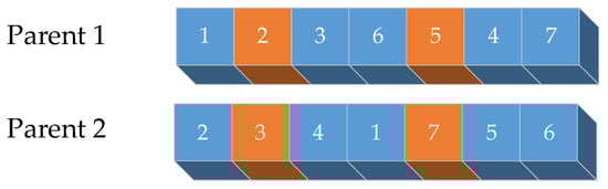 - Step 1: Randomly select the starting and ending positions of several genes in a pair of chromosomes (parents), ensuring that the selected positions are identical in both chromosomes. As in Figure 2, the orange color is the selected gene.