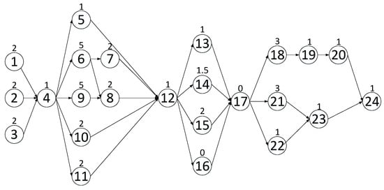 Based on the estimated battery recycling process in an actual factory, detailed reference data for disassembly tasks, including their respective durations, costs, power requirements, and safety-level compensation coefficients, are presented in Table 2. Utilizing general disassembly operation experience, an initial assessment of the risk coefficients for these tasks (ranging from 0 to 5, with 0 indicating almost no risk and 5 indicating the highest risk) is conducted. An extended risk coefficient-based component prioritization graph is then plotted, as shown in Figure 7. The number above the circle represents the risk factor of the component.