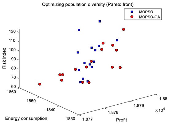 To further validate the superiority of the improved MOPSO-GA in solving the IRA-DSP model, this paper compares the two algorithms from four perspectives: population distribution, iterative optimization process, the number of Pareto-front solutions, and hypervolume (HV). Figure 9 depicts the population distributions of the two algorithms. The crossover and mutation operations of the improved MOPSO-GA increase the diversity of the population, avoid premature convergence, and result in a more extensive and uniform population distribution. The iterative optimization comparison process between the two algorithms is illustrated in Figure 10. The iterative optimization process of the improved MOPSO-GA is generally more stable and sustainable, converging to better solutions faster compared to the original MOPSO.