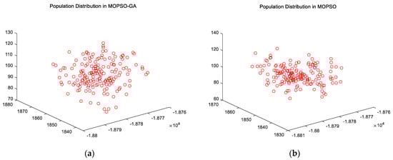 The population distributions of the two algorithms: (a) population distribution in MOPSO-GA; (b) population distribution in MOPSO.