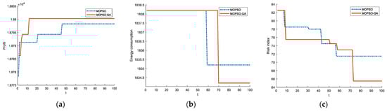 Comparison of iterative optimization of algorithms: (a) profit iterative optimization; (b) iterative optimization of energy consumption; (c) iterative optimization of risk index HV.