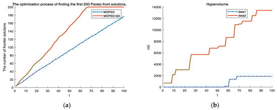 Algorithm performance analysis: (a) the optimization process of finding the first 200 Pareto front solutions; (b) hypervolume.