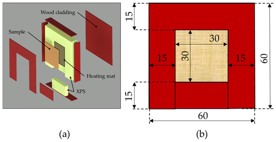 In this work, a new hand-made system was built to thermally insulate a square wooden sample to create a consistent, stable temperature difference between the sample and the environment. Extruded polystyrene (XPS) panels, with a thickness of 0.05 m, were formed and arranged to construct an insulating framework capable of accommodating the sample. The XPS assembly was characterized by the same height and width, equal to 0.6 m, and a thickness of 0.10 m. To ensure greater structural stability, the XPS assembly was enclosed by wooden panels. The sample was made of poplar wood, and it had a square shape, characterized by a height of 0.3 m, a width of 0.3 m and a thickness of 0.015 m. An electric heating mat was installed in the central part of the structure. It consisted of a polyester flexible heating film made by screen printing with silver and carbon paste, manufactured by ALPER. It worked at a low constant temperature and the voltage and wattage were equal to 230 V and 16 W, respectively. The heating mat was characterized by dimensions equal to 0.28 × 0.28 m, with a thickness of 0.001 m. The assembly had been designed allowing the removal of a part to facilitate the placing of the sample.