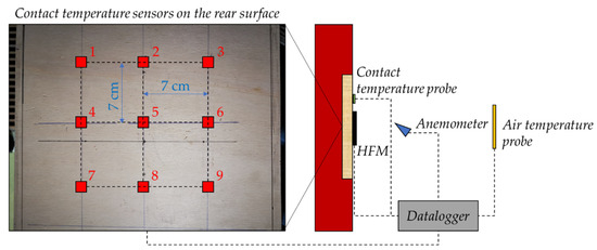 The heated sample was equipped with sensors for performing heat flux measurements through direct and indirect approaches. On the back surface of the sample, contact temperature probes were applied for evaluating the homogeneity of the sample heating. Specifically, nine sensors were applied within a matrix with a spacing of 0.07 m, with three equidistant sensors on three equidistant lines. On the front free surface of the sample, 1 heat flux sensor and 1 contact temperature probe were installed for the direct heat flux and surface temperature measurements, respectively. An anemometer (hot-wire type) was placed in front of the sample, at different distances, to monitor the air velocity. Finally, a thermal imaging camera was employed for evaluating the overall front surface temperature. Table 1 outlines the key technical specifications of the equipment, while Figure 3 illustrates the experimental configuration.