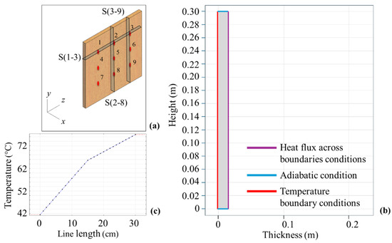 - Identification of thermal inhomogeneities effects and positioning of the sensors for the heat flux evaluation: The effects of thermal non-uniformities must be assessed in relation to the deviation of the heat flux from one-dimensional conditions. This condition can affect the results, and the magnitude of the possible heat flux distortions can be analyzed by creating a bidimensional simulation model. Here, Comsol Multiphysics was used, and different 2D models of the sample were created, considering the back surface temperature sensors, due to the experimented thermal inhomogeneities. The thermal image obtained through the infrared camera was processed to evaluate the temperature distribution on the sample, thus identifying the hottest part and the zones characterized by reduced thermal inhomogeneity. The experimental investigation revealed specific areas of the wooden sample with higher temperatures than others. Consequently, the sections shown in Figure 4a were modeled, where S(1–3) identifies the section associated with the sensors 1, 2 and 3, S(2–8) identifies the section associated with the sensors 2, 5 and 8, and finally, S(3–9) identifies the section associated with the sensors 3, 6 and 9. Figure 4b shows the thermal boundary conditions set in the models in terms of the heat flux, temperatures and adiabatic conditions. The temperature differences among the 9 points and their spatial distribution allowed us to calculate a temperature difference per centimeter (∆T/cm), which was used for calculating the temperature distributions along the Y and Z axes (see Figure 4c). A thermal conductivity of the poplar wood equal to 0.12 W/mK was preliminarily assigned, then adjusted to 0.09 W/mK [38]. A heat flux across boundaries condition was set for the free surface of the sample, with a preliminary total heat transfer coefficient of 7.69 W/m2K, then changed to 9.67 W/m2K. It is worth observing that these changes were performed within an initial iterative process based on the experimental data. Once the model was completed, the consistency of the analysis was associated with the ratio between the horizontal heat flux component (x component) and the other ones (y and z components). The requirement applied in this study was that these ratios must be less than 5% [39].