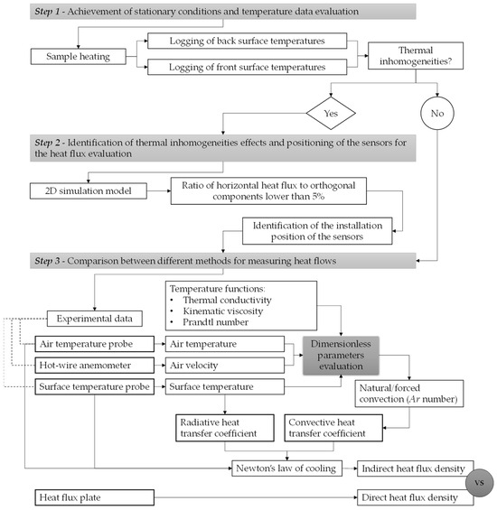 As already mentioned, the heated wooden sample was equipped with several sensors for logging data related to the heat fluxes, temperatures, and air speed. All the physical parameters were employed in a methodology characterized by the following steps: