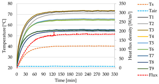 The thermal image obtained through the infrared camera allowed us to identify the temperature distribution of the sample and the area characterized by higher temperatures (see Figure 8a) and a reduced thermal inhomogeneity where the heat flux plate and the surface temperature probe were mounted (see Figure 8b).