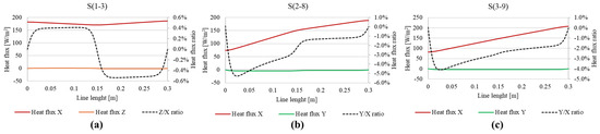 Heat flux components and heat flux ratio for the modeled sections: (a) section S(1–3); (b) section S(2–8); and (c) section S(3–9).