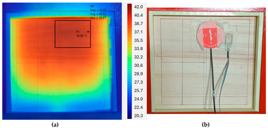 (a) Thermal image obtained through the infrared camera: the scale specifies the temperature range from 20.3 °C to 42.0 °C; point marker at 39.98 °C; rectangle marker shows a variation from 38.87 °C to 42.01 °C. (b) Sensors’ position.