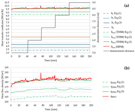 As already mentioned, different distances of the anemometer were considered (distance identified by the black line in Figure 9a). The negligible influence of the distance of the anemometer is demonstrated by the flat trend of the curves. The total coefficients were also found by calculating the ratio between the data measured by the heat flux sensor and the surface air temperature differences (red line in Figure 9a, labeled htot(HFM)). No noteworthy differences were noted.