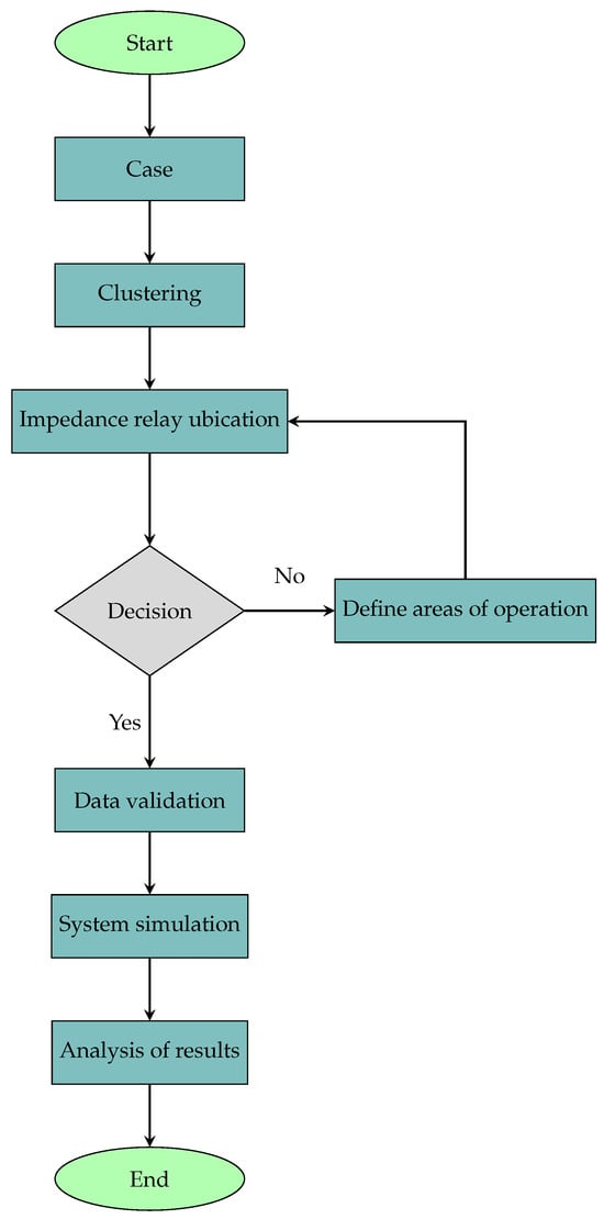 Using CYME simulation software (Version 9.0), a georeferenced medium-voltage distribution system was designed to validate the proposed methodology. Through various case studies, the performance of impedance relays was tested, employing clustering methods to determine the optimal number and placement of relays. This approach not only identifies the operational zones of impedance relays but also demonstrates the robustness and adaptability of the proposed solution in real-world scenarios. Figure 1 shows an overview of the proposed methodology, while Table 1 lists the nomenclature used in this study.