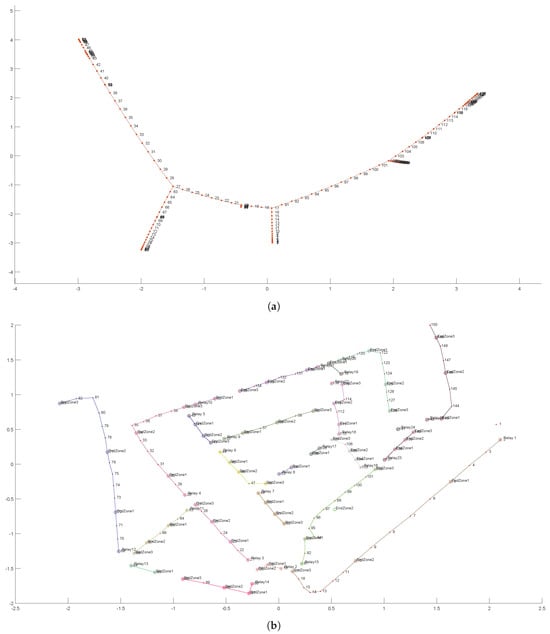 Results of implementing Algorithms 3 and 4: (a) change in the numbering of the nodes belonging to the network, same structure shown in previous graph, and (b) locations of the relays that make up the system and the zone divisions of each relay reorganization.
