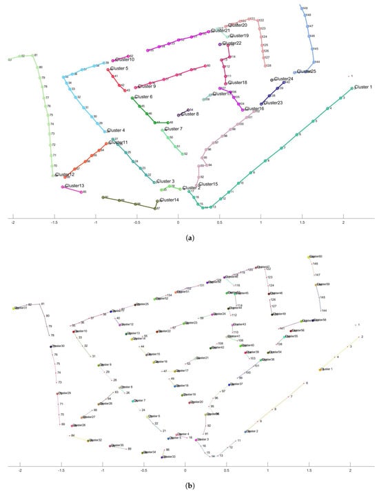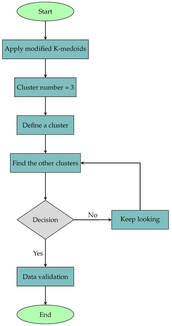 The final step involved dividing the relay operating zones based on various characteristics. For this case, a relay with three zones of operation was selected, and the position of a cluster, which could be a start- or endpoint, was determined. In this scenario, the endpoint was selected, and the remaining clusters were identified, as shown in Figure 4. Algorithm 6 applies the modified K-means method to determine the operating zones for each relay. This algorithm processes the data from Algorithm 5, dividing the sections handled by each relay. The sequence of Algorithm 6 is shown in Figure 6.