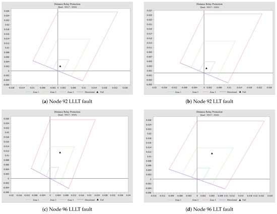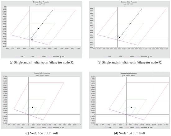 In case one, each node belonged to an impedance relay and a zone; a simple fault was applied to nodes 92, 96, 101, 101, 104, 105, and 106, checking if the impedance relay was detected, identifying in which zone the fault was located, and which impedance relay identified it; see Figure 8; furthermore, the operating points of relays 92 and 96 were observed in front of a three-phase and two-phase fault with arc; the operating point was maintained in the impedance line that was programmed to the relay, indicating that the fault was detected effectively; in Table 4, the results of currents and voltages during the fault event are exposed.