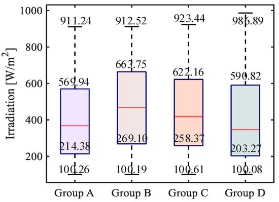 Because the accuracy of the boxplot is easily affected by the median of the data, the irradiation data should not contain too much low irradiation data. Therefore, this paper intends to extract the data with irradiations greater than 100 W/m2 into groups A, B, C, and D, and use the boxplot to show the distribution of irradiation. Figure 2 is the irradiation box line diagram. From the diagram, it can be seen that the irradiation distribution of the four groups’ data is basically the same. The irradiation above 600 W/m2 accounts for about 25%, the irradiation between 200 W/m2 and 600 W/m2 accounts for about 50%, and the irradiation between 100 W/m2 and 200 W/m2 accounts for about 25%. It can be seen from Section 2.1 that when under the condition of medium irradiation the temperature is less affected, the photovoltaic power prediction in this irradiation interval is relatively accurate, and the proportion of medium irradiation is the highest. Therefore, when the irradiation interval distribution is set, the range of the medium irradiation interval is relatively wide, and the range of the high irradiation and low-irradiation interval is small. Combined with the boxplot of each group of irradiation, the initial irradiation interval distribution is set to be an ultra-low irradiation interval , a low irradiation interval , a medium irradiation interval , and high irradiation interval . The calculation formula of each interval is shown in Equation (1).