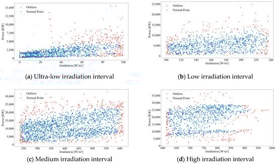 Considering the characteristics of photovoltaic power generation, this paper intends to use 5:00–20:00 photovoltaic power generation data to perform outlier detection on the data. Figure 4 is the outlier detection map of photovoltaic power generation power–irradiation in each irradiation interval.