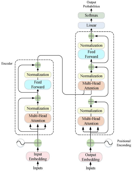 The Transformer model is a novel neural network architecture based on a self-attention mechanism, which aims to solve sequence–sequence tasks. Compared with the traditional neural network, the Transformer model not only solves the long-term dependence problem, but also can be trained in parallel, which greatly improves the operating efficiency of the model. The core content of the Transformer model mainly includes a self-attention mechanism, a multi-head attention mechanism, and position coding [25,26,27]. Figure 5 shows the internal architecture of the Transformer model.