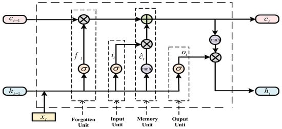 In Figure 6, , , , and represent the forgetting gate, the input gate, the memory gate, and the output gate in the internal structure of the LSTM, respectively, with indicating the update state of the memory gate, and being the output at time t. The calculation formulas of each part are shown in Equation (7).