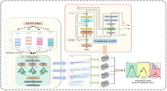 In order to improve the prediction accuracy of short-term photovoltaic power generation, this paper proposes a prediction method based on irradiation interval distribution and Transformer-LSTM, and the specific framework flow is shown in Figure 8.