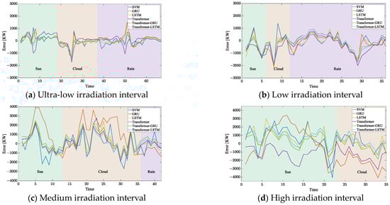 Combined with the analysis of Figure 9 and Table 2, the data of the ultra-low irradiation interval are mainly concentrated in the time period with the lowest solar radiation in a day, such as in the morning and evening. The data proportion is basically the same under the three weather conditions. The irradiance and temperature in this interval are the lowest, which has the least influence on the photovoltaic power generation process. Compared with other irradiation intervals, it is the least difficult to predict the photovoltaic power, so the error fluctuation range is the smallest. Among the single models in this interval, the Transformer performs best and the prediction error is the smallest, the MAE = 0.3250, and the RMSE = 0.4645. The combined model shows great improvement over the performance of the single model. Among them, the Transformer-LSTM prediction model proposed in this paper performs best: an MAE = 0.2843, an RMSE = 0.4212. Compared with the Transformer model, the accuracy of the MAE index is improved by 12.52% and the accuracy of the RMSE index is improved by 9.32%. Compared with the Transformer-GRU combined model, the accuracy of the MAE index is improved by 6.63% and the accuracy of the RMSE index is improved by 3.74%.