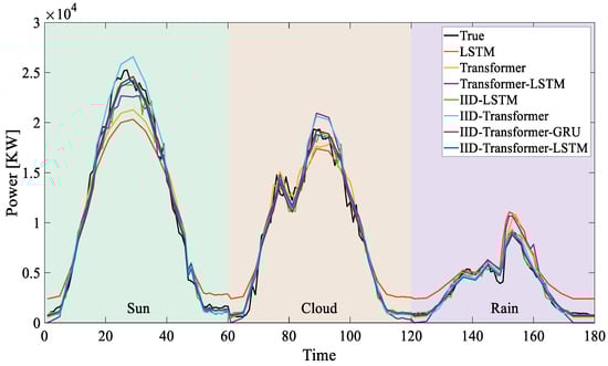 In order to further verify the accuracy and universality of the prediction method proposed in this paper, five comparison models are constructed to predict sunny, cloudy, and rainy days, respectively. The model information is shown in Table 3. In Table 3, the photovoltaic power prediction model based on IID refers to the following process. First, divide the original data into multiple parts according to the irradiance, and then construct the photovoltaic power prediction model of each part. Then, the photovoltaic power of each part is predicted, respectively. Finally, the final photovoltaic prediction power is obtained by combining the photovoltaic prediction power of each part in chronological order. The prediction results of each model are shown in Figure 10, and Table 3 provides the performance indicators of each model.