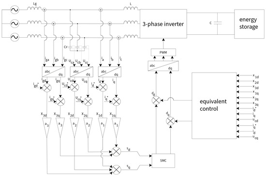 This work focuses on the simulation studies of proposed sliding mode control systems, which perform the task of controlling the main grid current in the structure of an inverter connected via an LCL filter to the power grid. The sinusoidal signals present in the three-phase system have been subjected to dq0 transformations, which allow for the simplification of the control system and maintain frequency synchronization with the power grid [7,34,35,36]. The control algorithms presented in the further part of the work allow for full-range regulation of the d and q components of the grid current vector.