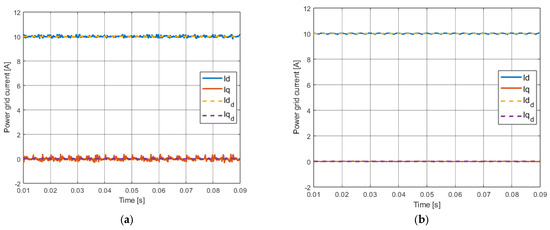 In the second dynamic test, the case was examined when the set signal of the grid current vector component passed through the value 0. The obtained waveforms are presented in Figure 8.