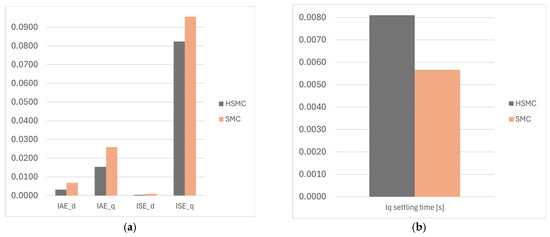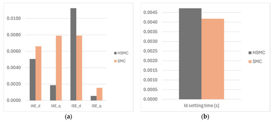 Figure 9 shows the control measures for the test performed—(a) includes IAE and ISE for two current components, while (b) concerns the adjustment time. The presented numerical values were extracted based on Figure 8.