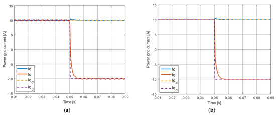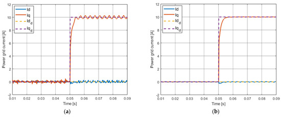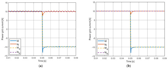 Vector current component waveforms for the second dynamic case—change in from 10 to −10 A, equal to 10 A. (a)—results for classic SMC; (b)—results for modified SMC.