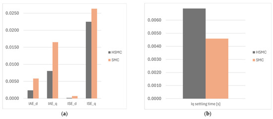 For the hybrid algorithm, this indicator is slightly larger, which may be at the expense of reducing oscillations to a great extent (13% higher value of settling time). The indicators presented in (a) indicate that better quality regulation is provided by HSMC (IAE: for d component reduced by 23% and for q component reduced by 76%).