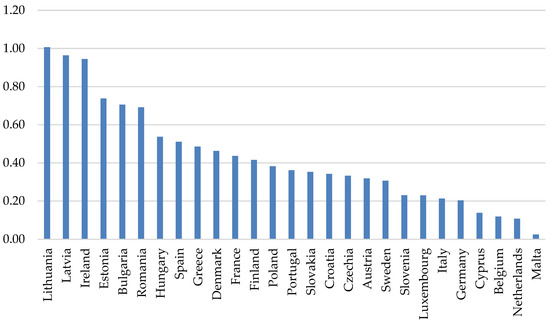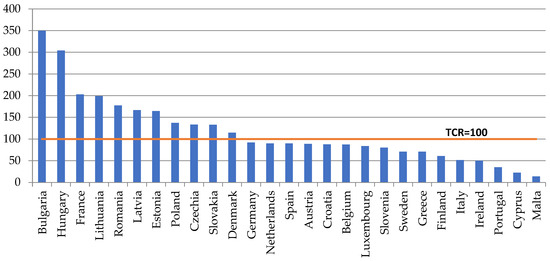 Another sub-indicator used in the construction of the synthetic index was the Trade Coverage Ratio (TCR = (Exports/Imports) × 100) calculated for food and live animals (SITC 0). The interpretation of this indicator is that countries with a TCR above 100 have a positive agri-food trade balance and are among those with food self-sufficiency [55]. In food-self-sufficient countries, agricultural surpluses that are diverted for export could instead be used locally as feedstock for biofuel production, and the land used for surplus crops could alternatively be used to produce the raw materials from which biodiesel and bioethanol are made. From Figure 4, it can be seen that countries where the average TCR calculated for 2010–2021 exceeded 100 included Bulgaria, Czechia, Denmark, France, Estonia, Latvia, Lithuania, Hungary, Poland, Romania, and Slovakia.