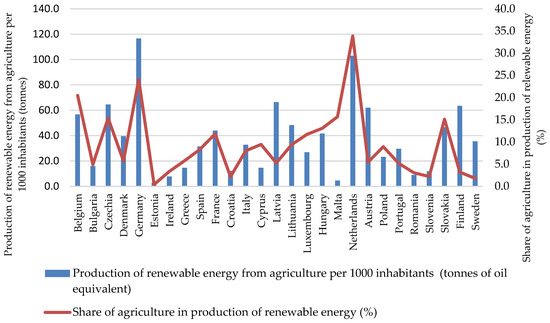Due to the growing population, the scale of human economic activity, and the associated exploitation of natural resources, one of the main challenges in the modern world is the need to protect the environment, combat climate change, and use natural resources sustainably. Therefore, the basic elements of the current European energy policy are energy security and climate change mitigation [1]. The European Union emphasises closer links between climate policy and the development of renewable energy sources [2]. Renewable energy is considered to interact with many aspects of sustainable development [3] and the Sustainable Development Goals, specifically Goal 7 (ensure access to affordable, reliable, sustainable, and modern energy), but it also relates to Goal 12 (ensure sustainable consumption and production patterns). In addition, renewable energy sources have a considerably smaller adverse environmental impact than conventional fossil-based technologies [4,5]. Agriculture and the food economy are also objects of climate and energy policies. This stems from the links between the agricultural sector, renewable energy, and sustainable agriculture [6,7]. On the one hand, agriculture is a significant energy consumer, while on the other hand, the relationship between energy and sustainable agriculture goes far beyond the use of renewable sources [8]. In 2022, on average, agriculture utilised approximately 3% of the gross final energy consumption in 21 EU Member States. This percentage varies from country to country, ranging from 7.5% in the Netherlands to 0.9% in Luxembourg [9]. Sustainable agriculture practices that aim to minimise environmental impacts and increase productivity and energy play a key role in achieving these objectives [10]. Therefore, not only does the agricultural sector emit greenhouse gases and consume energy [11], but it simultaneously has the potential to produce renewable energy [12].
